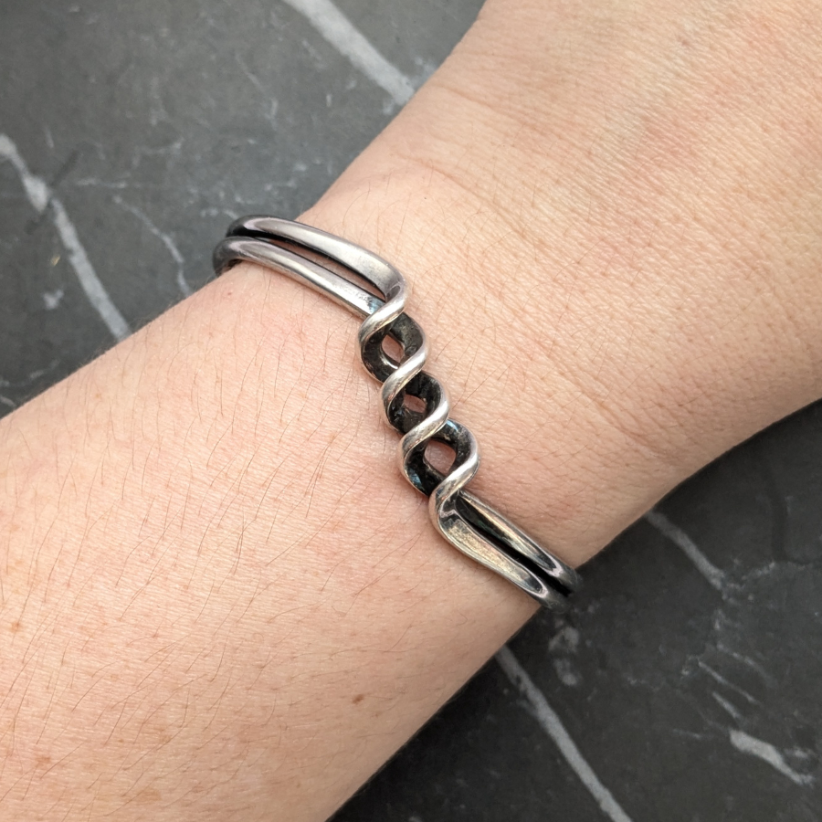 Oval shaped with a lovely twist finish in the centre. This is a cuff bangle and can be adjusted by pulling it open further or pushing the ends closer together.