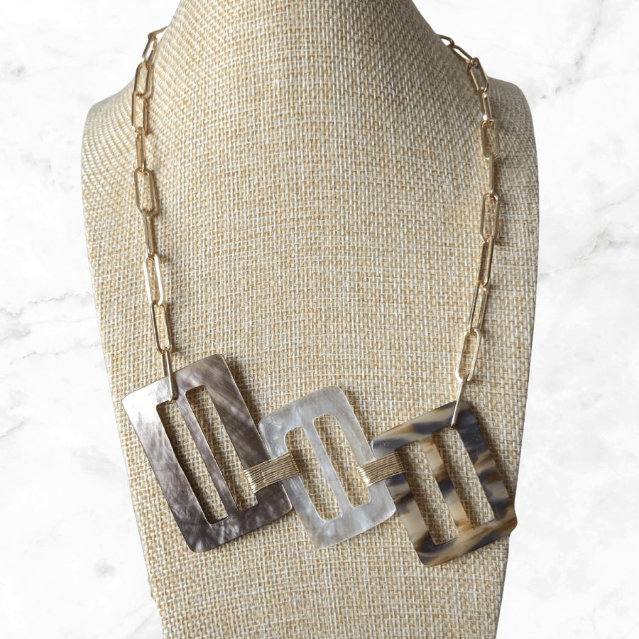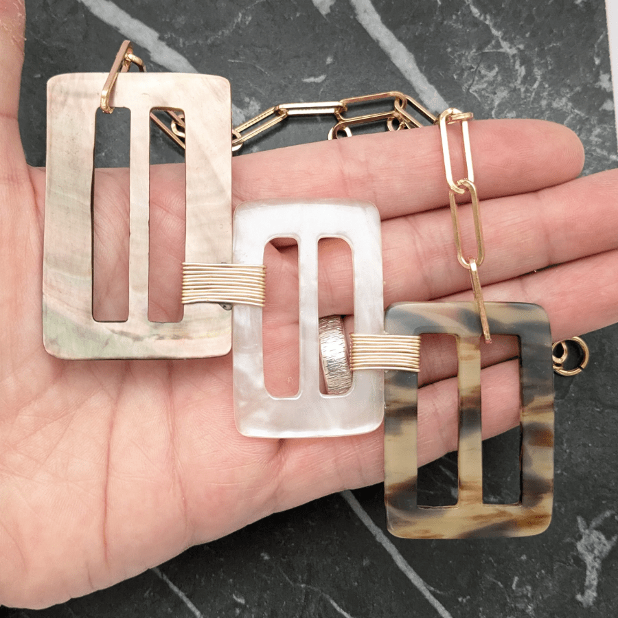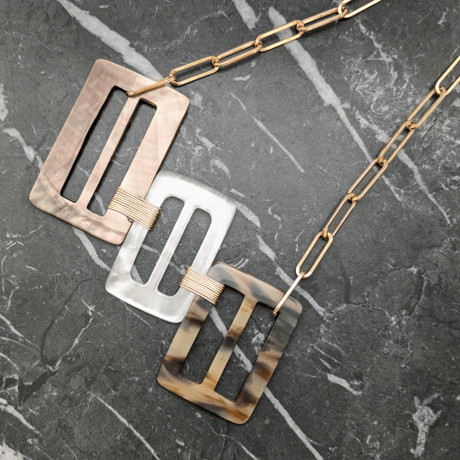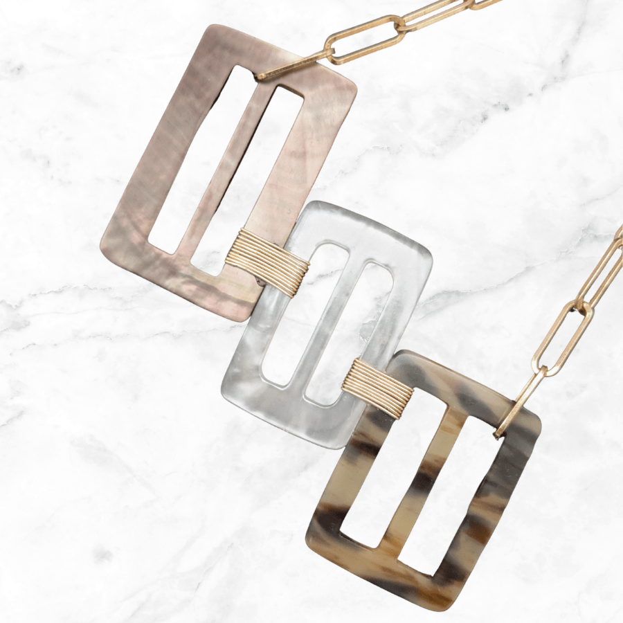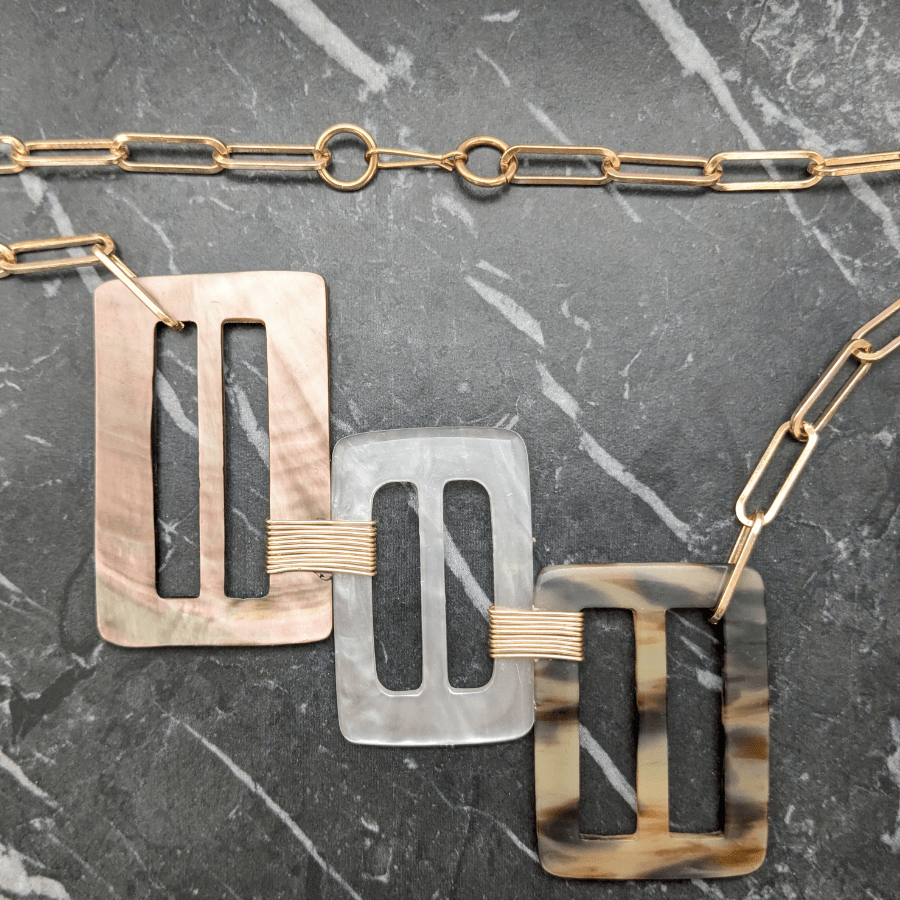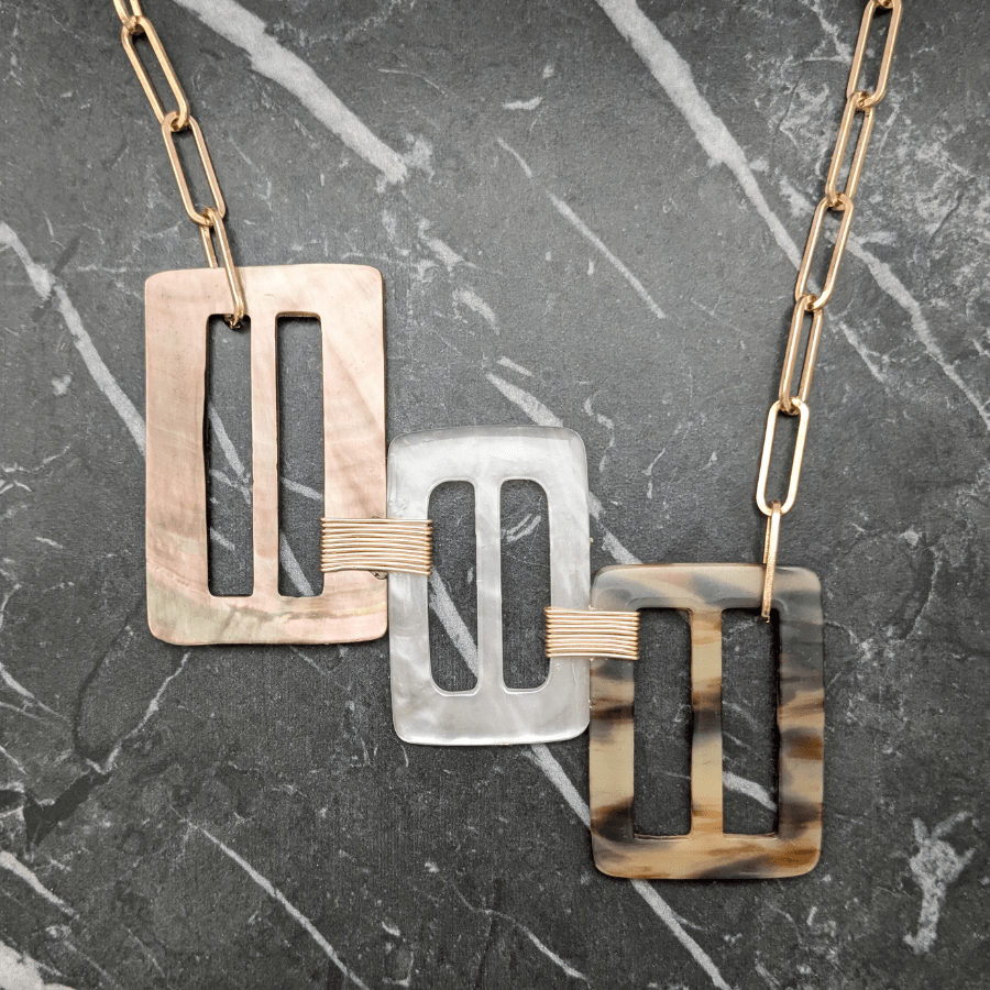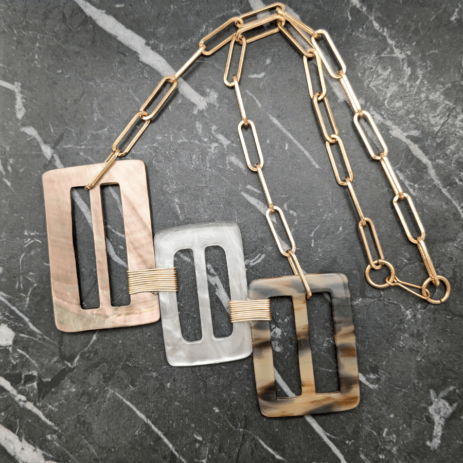 Suspended from a light gold tone chain, allowing the design to sit beautifully as a statement focal point when worn. This particular necklace features a beautiful Mother of Pearl buckle.
