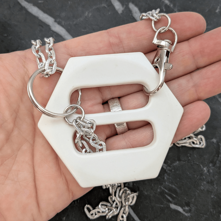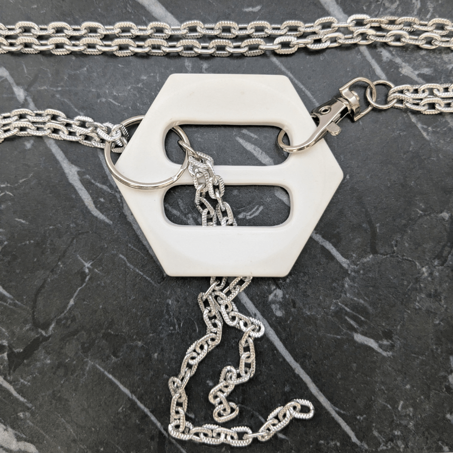 • Chain threaded through the buckle with a drop detail