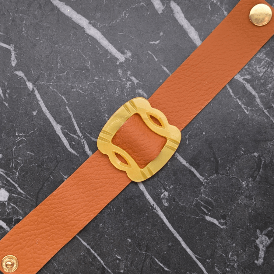The buckle is slid onto the leather band and becomes the focal point of the bracelet, celebrating the craftsmanship and design of vintage hardware. The bracelet fastens securely with press studs, making it easy to wear while maintaining a clean, stylish finish.