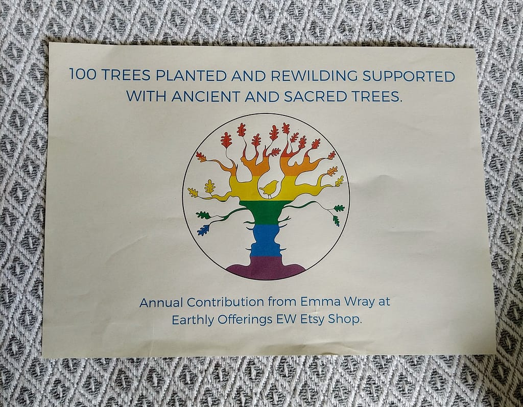 Another passion of mine is spending time amongst the trees and I love nothing more than bumbling about in a forest, foraging and enjoying the company of the trees around me. In order to give something back through my business, I make an annual donation to ancient and sacred trees, for the planting of trees in the UK and worldwide. AST is a Not-For-Profit community run by volunteers. This charity plants trees in various locations around the world. So far I’ve had the privilege of being able to plant 351 trees, through profits raised from my Etsy shop. Each year I’ll add a new certificate to acknowledge the planting of trees and to show my commitment to giving something back to the earth.